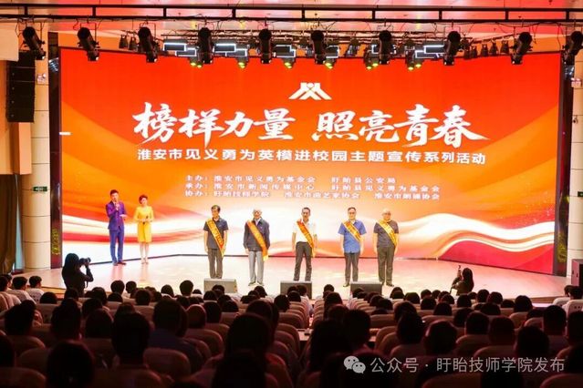 “民族有精神,国家有力量,让我们致敬英雄,崇尚荣光,奋勇前行!”在4名朗诵老师铿锵有力的声音中,“榜样力量 照亮青春”——淮安市见义勇为英模进校园主题宣传系列活动盱眙专场巡演圆满完成。