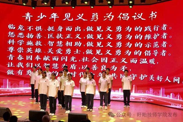 舞台之上,我院学生代表们以清脆有力的声音向全社会发出倡议:“临危不惧、挺身而出,做见义勇为的践行者;惩恶扬善、匡扶正义,做见义勇为的维护者;科学施救、智慧相助,做见义勇为的示范者;尊崇英雄、关爱勇士,做见义勇为的倡导者。”