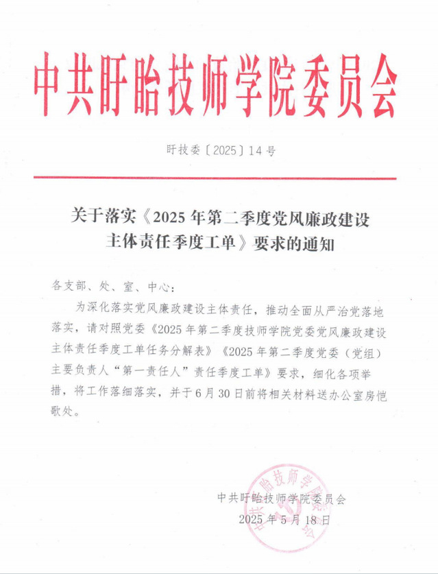 关于落实《2025年第二季度党风廉政建设主体责任季度工单》要求的通知